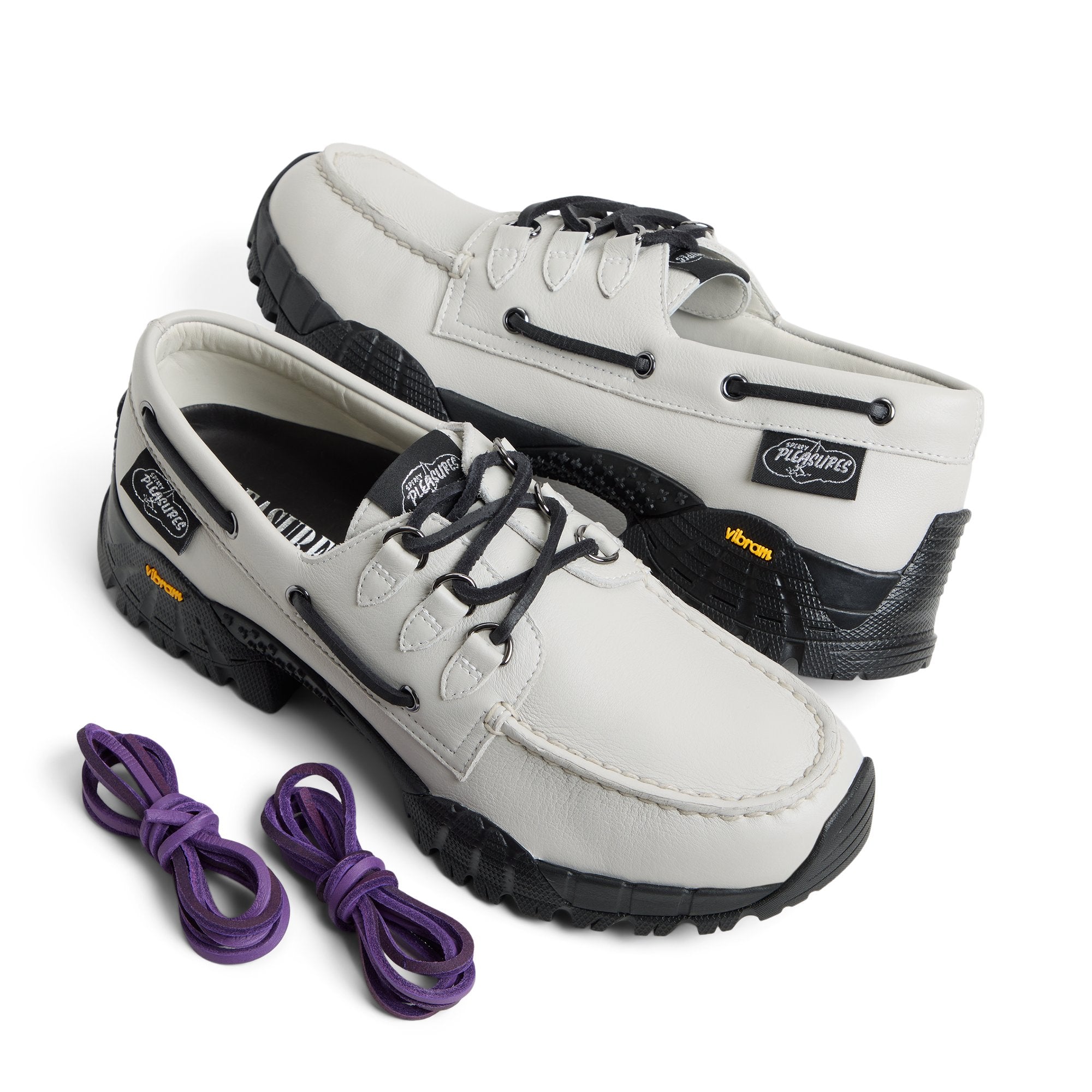 The Sperry x PLEASURES 3-Eye Vibram Hiker brings an unexpected lifestyle vibe to a classic hiking silhouette. Uniting a gold-rated leather upper. a Vibram 629C Vybrid Hike outsole. and an EVA midsole. this shoe is ideal for trail running (or running around town!). Take your pick between black or purple leather laces and hit your path of choice.